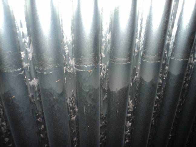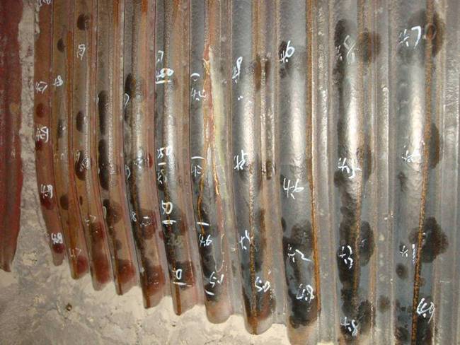 某锅炉水冷壁焊缝附近的磨损照片 某锅炉密相区耐火浇注料上方水冷壁磨损照片